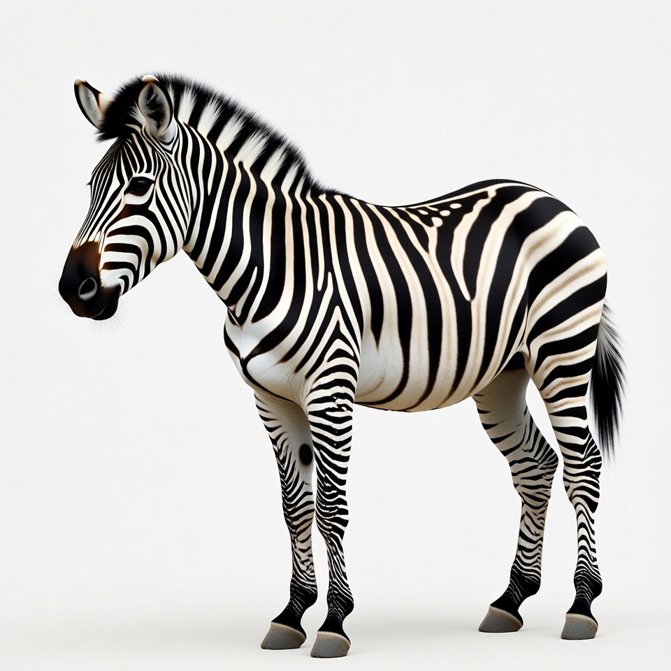 A zebra stands in a side profile view against a plain white background. Its black and white stripes cover its body, mane, and legs distinctly. The zebra faces slightly to the left with its tail extended.