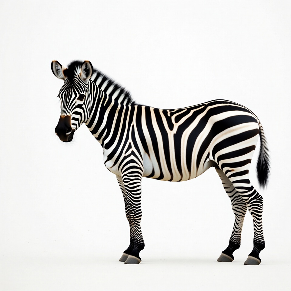 animal, black white, ears, equine, hooves, isolated background, mammal, mane, side view, standing, stripes, tail, wildlife, zebra