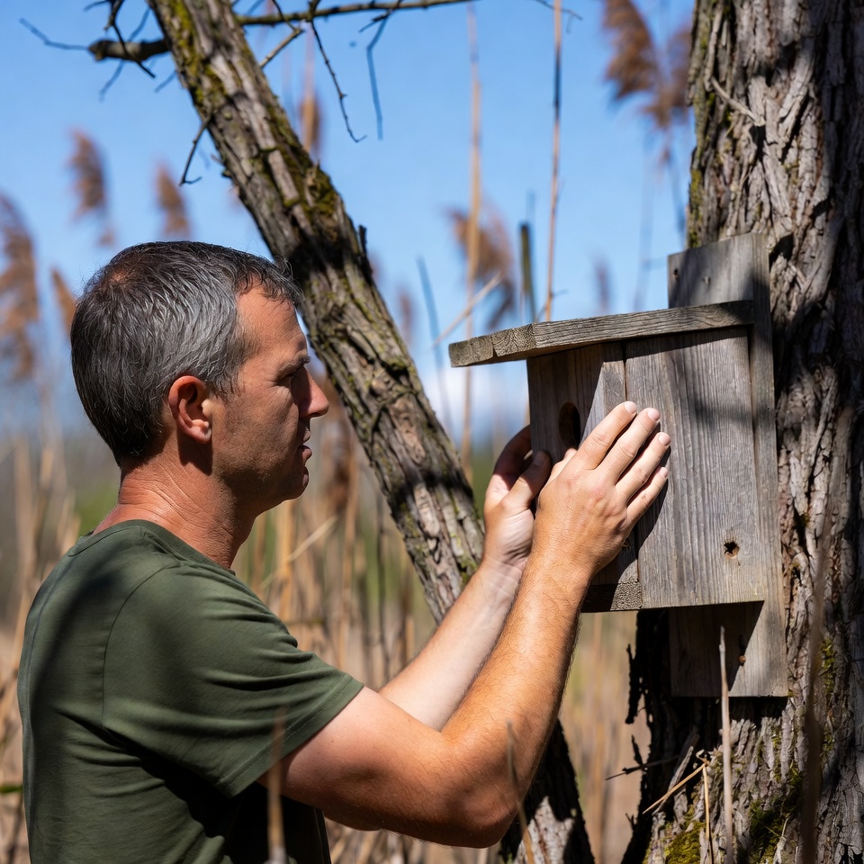 A middle-aged man with short graying hair kneels beside a tall tree, examining a wooden birdhouse attached to the trunk. He wears a green t-shirt and holds the birdhouse with both hands. Reeds and blue sky form the background.