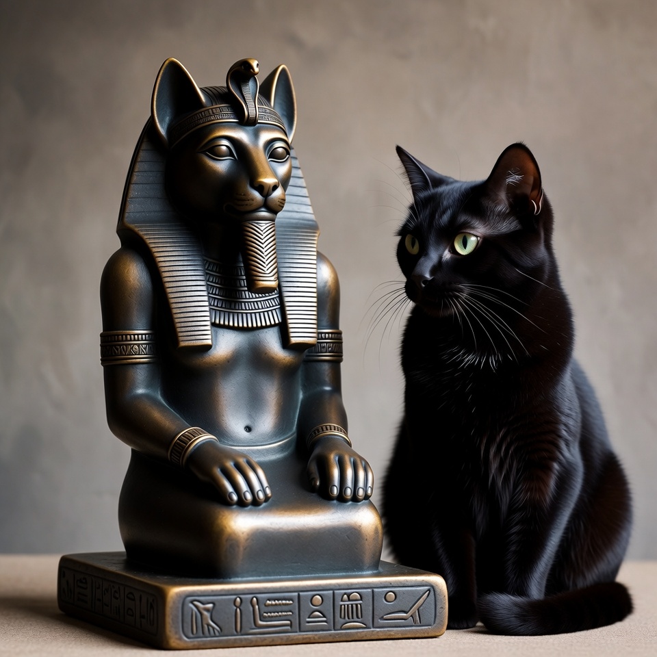 A bronze statue of the Egyptian goddess Bastet, depicted as a seated cat-headed woman with hieroglyphs on its base, stands on a textured surface. A real black cat with green eyes sits beside the statue, looking at it. Both are positioned against a neutral gray background.