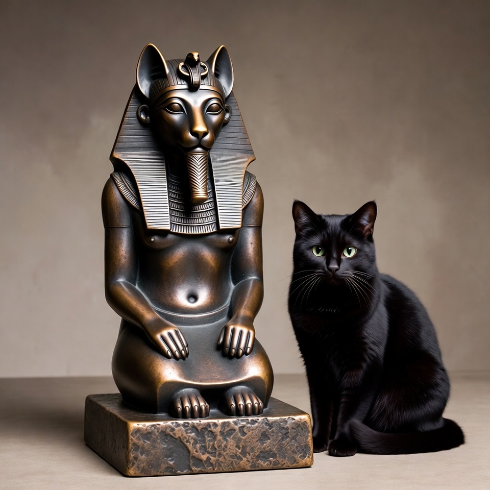 A bronze statue of the Egyptian goddess Bastet with a cat head sits on a stone base. A live black cat with green eyes sits beside the statue on a neutral background. The statue features detailed Egyptian attire and hieroglyphic elements.