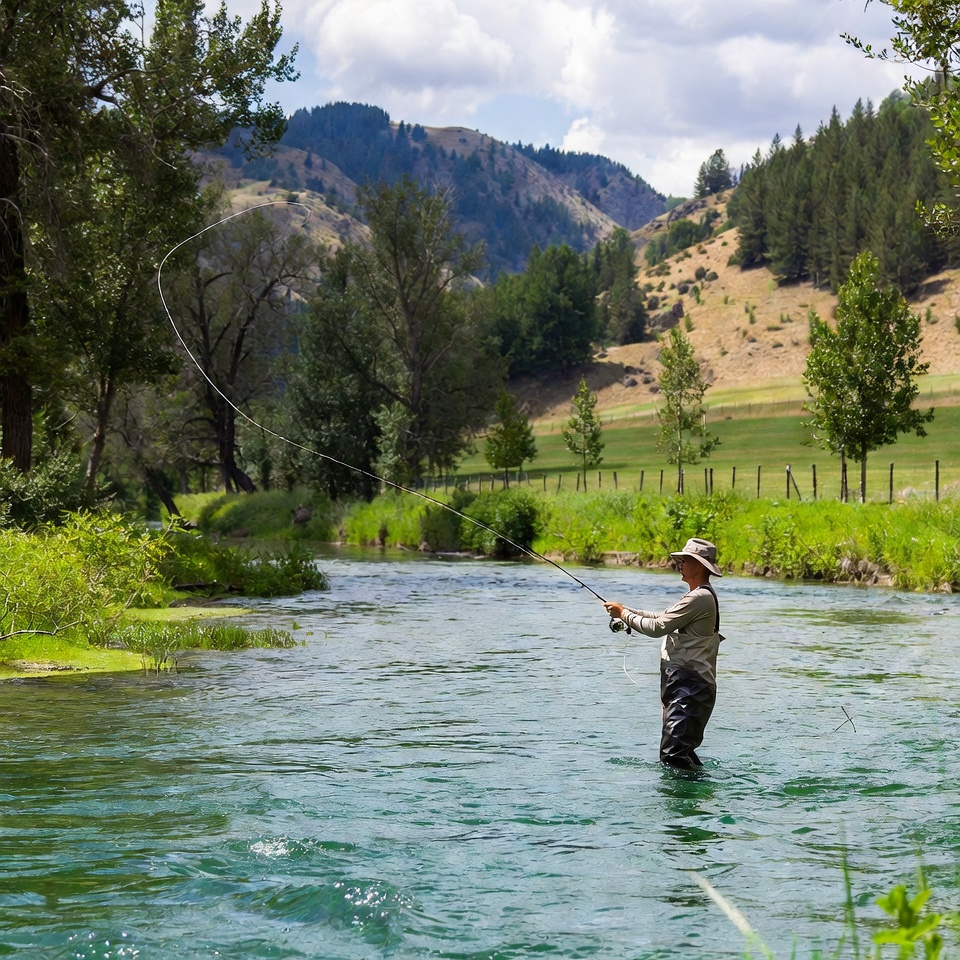 White, angler, casting, cloudy sky, fence, fishing line, fishing rod, forest, grass, green river, hat, hills, landscape, male, man, mountains, nature, outdoors, river, stream, summer, trees, trout fishing, waders, wading, water, fly fishing