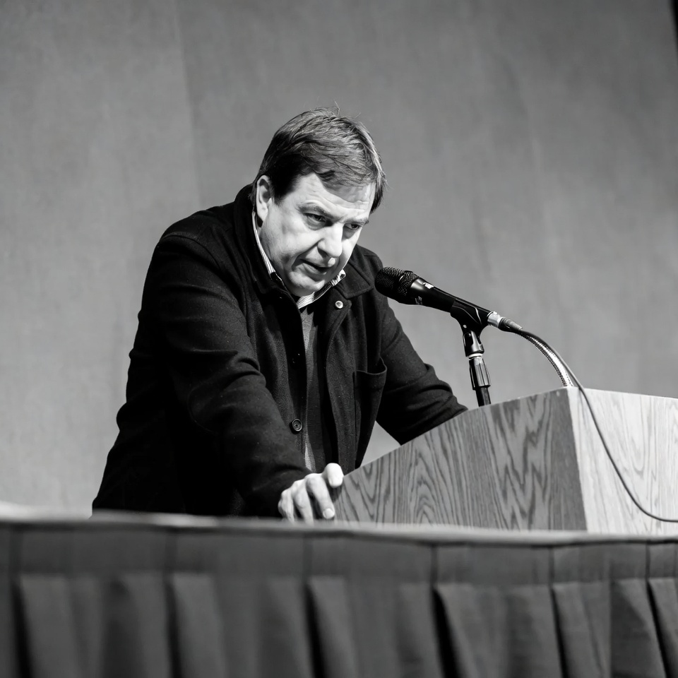 A middle-aged White man with short dark hair stands at a wooden podium on stage, leaning forward while speaking into a microphone. He wears a dark suit jacket and white shirt, captured in a black and white photograph. The background features dark curtains.
