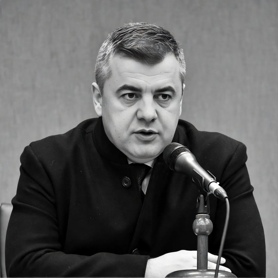A middle-aged man with short gray hair and a suit speaks into a microphone. He has a serious expression with furrowed brows and pursed lips. The image is in black and white against a plain gray background.