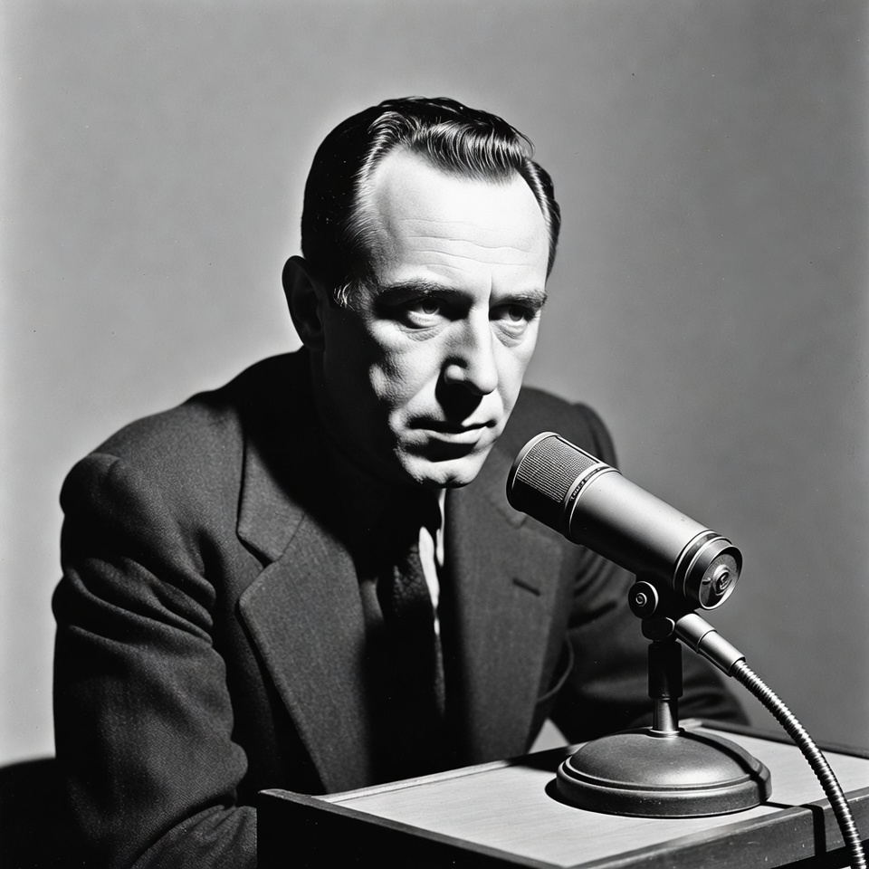 A middle-aged man with slicked-back hair stands at a podium speaking into a large vintage microphone. He wears a dark suit and tie, captured in a black and white photograph. His expression is serious as he leans slightly toward the microphone.