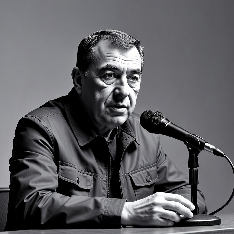 A middle-aged man with short dark hair and glasses speaks into a microphone at a podium. He wears a dark collared jacket and sits with hands resting on the table. The image is in black and white with a plain gray background.