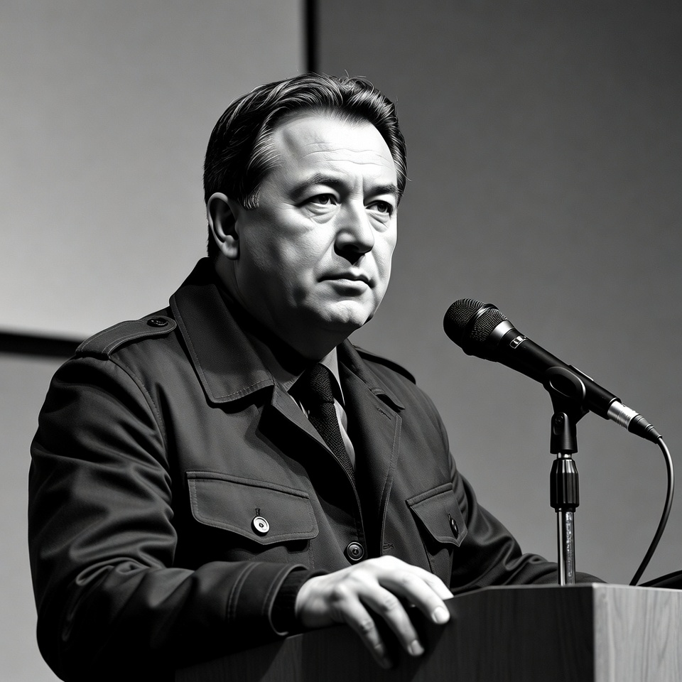 A middle-aged man with short dark hair stands at a wooden podium delivering a speech. He wears a dark trench coat with epaulets, a tie, and shirt, gripping the podium edge with both hands. A microphone is positioned in front of him against a plain backdrop in this black and white photograph.