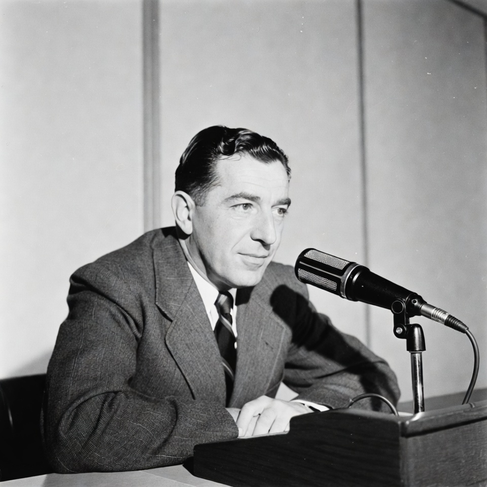A middle-aged White man in a gray suit and tie sits at a podium, speaking into a large vintage microphone. He has neatly combed dark hair and gazes slightly to the side with a subtle smile. The setting features paneled walls and a wooden desk in black and white.