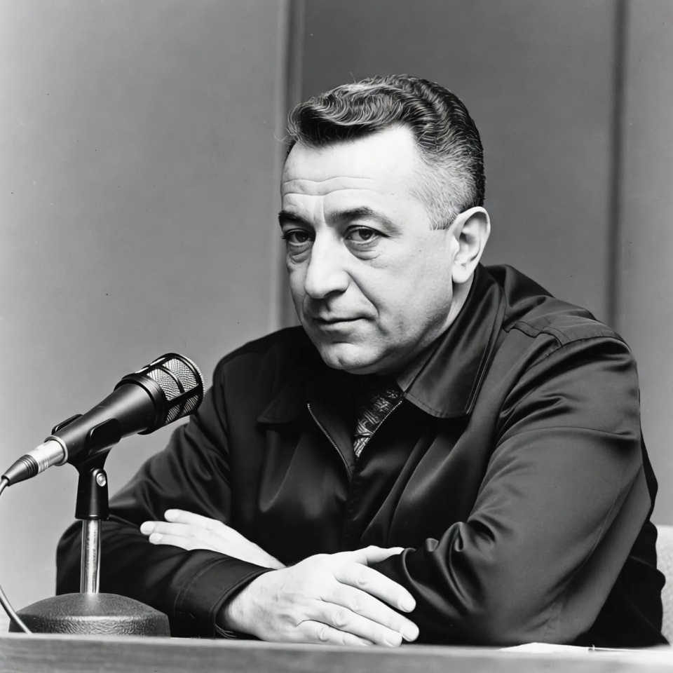 A middle-aged man with short dark hair sits at a wooden podium in a black collared shirt and tie. He leans forward with arms crossed on the podium, facing a vintage microphone. The image is a black-and-white photograph taken indoors against a plain background.