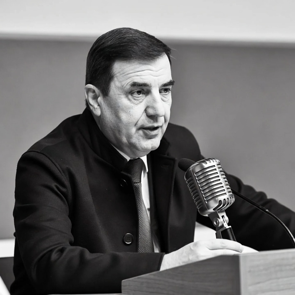 A middle-aged man with short dark hair and wearing a dark suit and tie speaks into a vintage microphone at a wooden podium. The image is in black and white, captured from a side angle. He stands confidently with one hand resting on the podium.