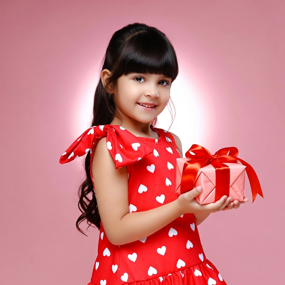 A young Asian girl with long black hair smiles while holding a red gift box wrapped with a red ribbon. She wears a sleeveless red polka dot dress with large white bow straps. The image features a bright pink background with a glowing effect.