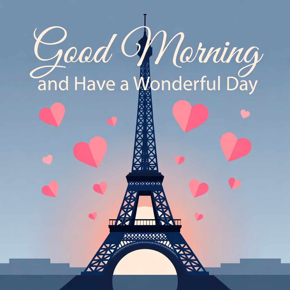 French icon, Paris landmark, blue sky, clipart style, dawn sky, floating hearts, good morning, graphic design, greeting card, hearts, illustration, inspirational quote, love hearts, morning greeting, motivational message, pink hearts, romantic greeting, silhouette tower, sunrise glow, text overlay, vector art, wonderful day, Eiffel Tower