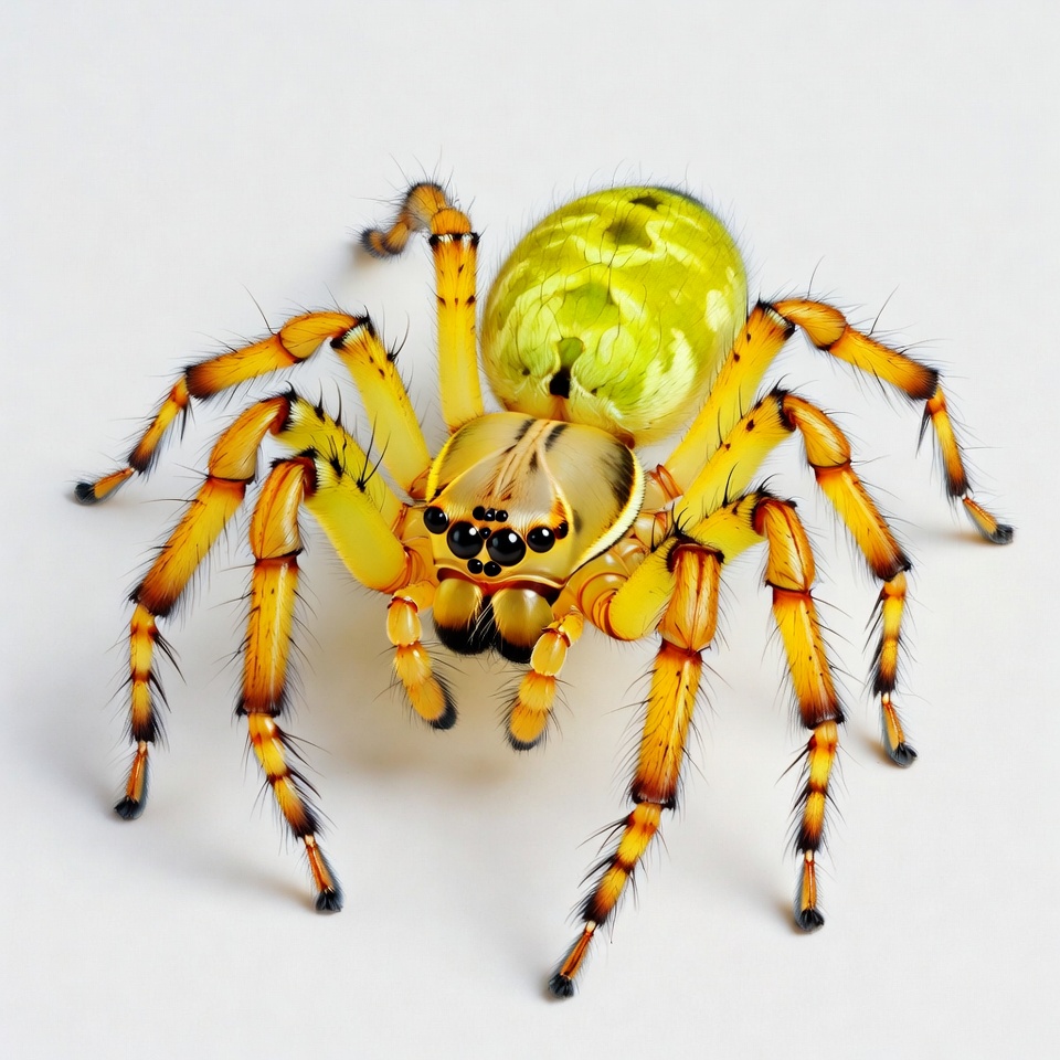 animal, arachnid, arthropod, black eyes, green spider, hairy spider, insects, isolated background, macro photography, orange markings, spider, white background, wildlife, yellow legs, lynx spider