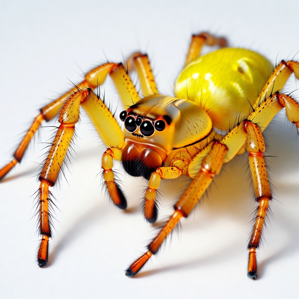 arachnid, detailed spider, eight legs, glossy abdomen, isolated, macro photography, multiple eyes, orange legs, spider close-up, spider face, vibrant yellow, white background, wildlife, yellow spider, jumping spider