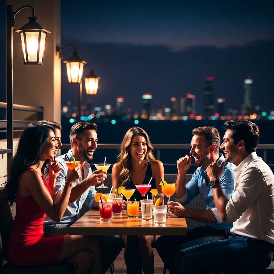 A diverse group of men and women sits around a wooden table on a rooftop balcony, toasting with colorful cocktails like margaritas and martinis. They laugh and enjoy the evening with city skyline lights and water view in the background. Lantern-style lamps illuminate the scene against the dark night sky.
