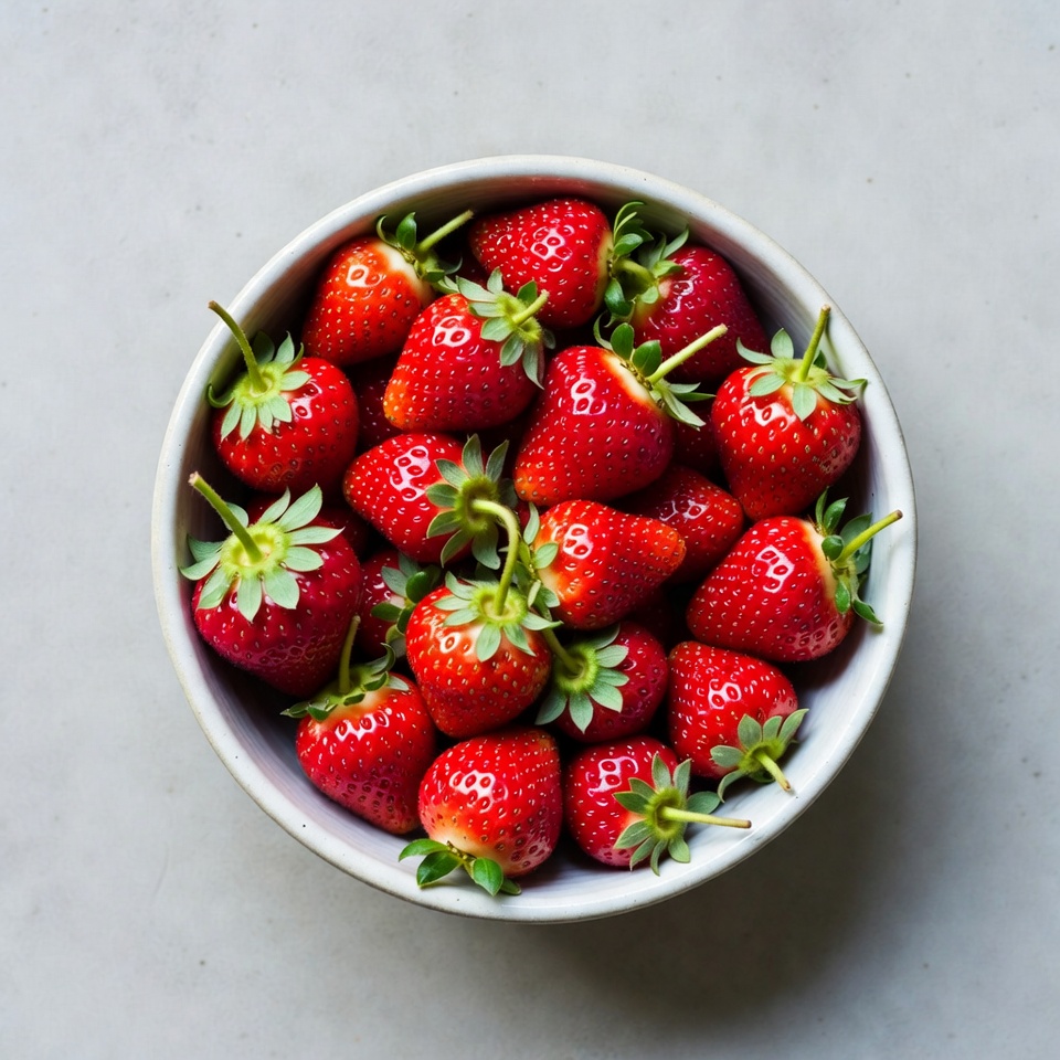 A white bowl filled with vibrant red strawberries sits on a white surface. The strawberries have green leaves and stems, arranged in a circular pattern from above. The image highlights the fresh texture and bright colors of the fruit.