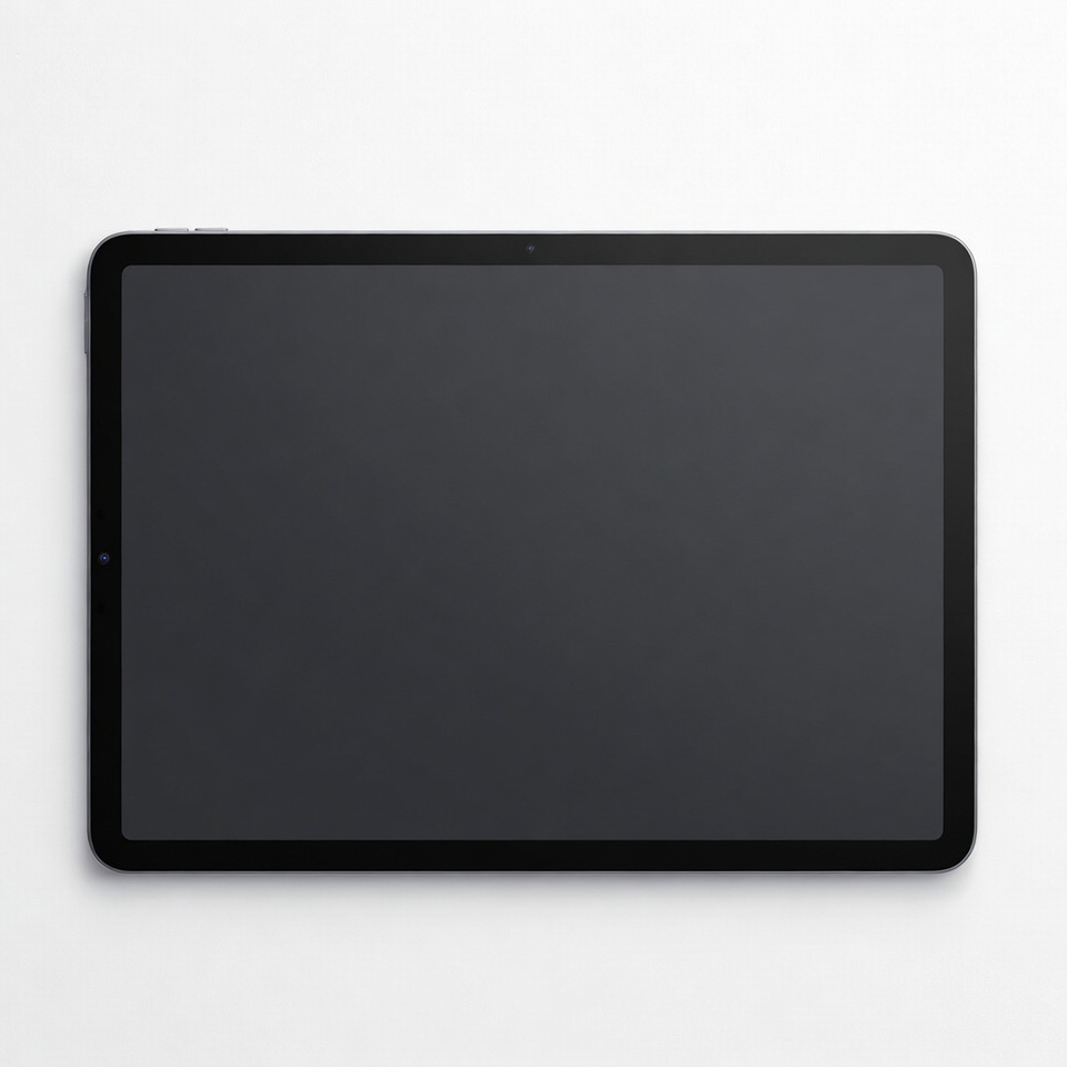 A sleek black iPad Pro tablet is displayed flat against a clean white background. The screen is off and shows a dark gray surface. The device has thin bezels and rounded edges, angled slightly for a top-down view.