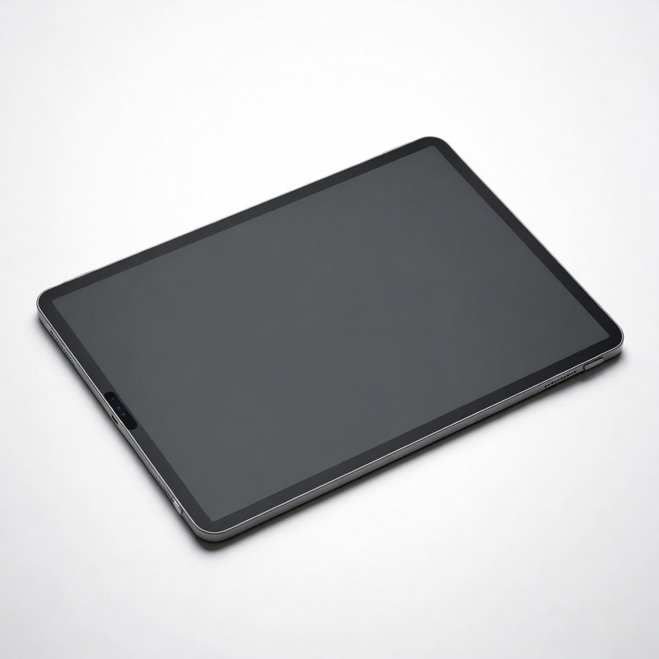 A sleek black iPad Pro tablet lies flat on a plain white surface. The screen is dark and off, showcasing its thin bezels and modern design. The device is angled slightly for a side view.