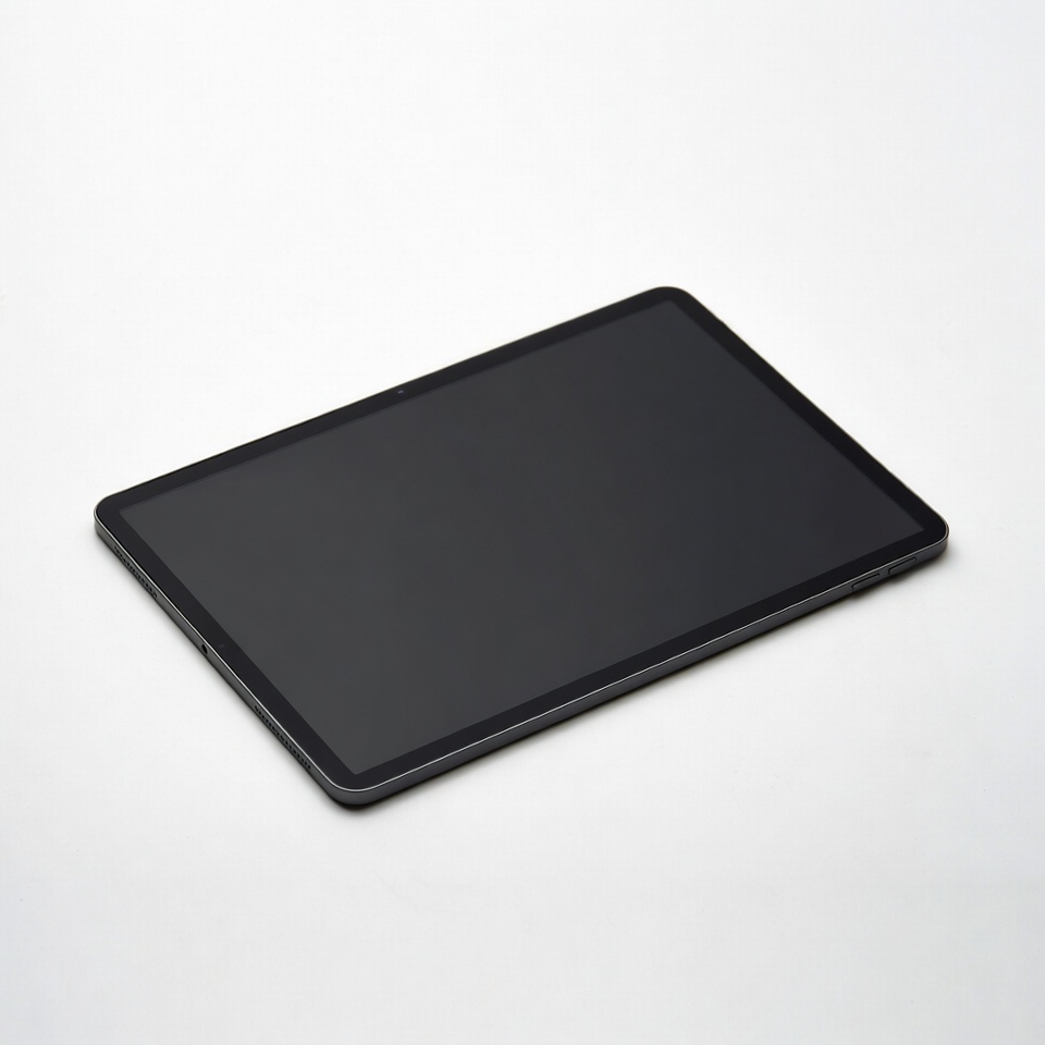 A sleek black tablet computer lies flat on a plain white surface. The screen is dark and off, showcasing its thin bezels and modern design. It is positioned at a slight angle for a clear side view.