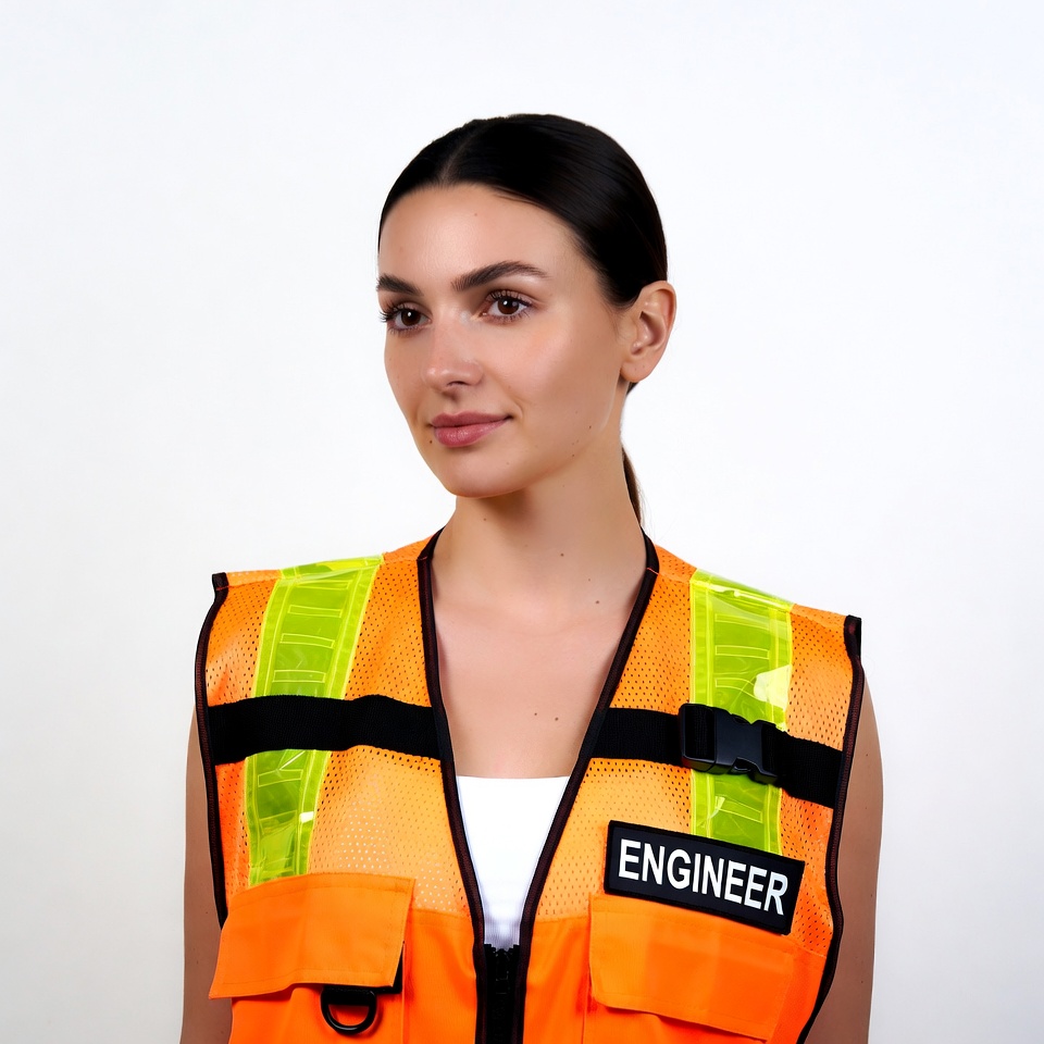 A woman with dark hair in a ponytail stands wearing a bright orange high-visibility safety vest labeled 'ENGINEER' over a white top. She has a subtle smile and looks slightly to the side against a plain white background. The vest features reflective strips and black trim.