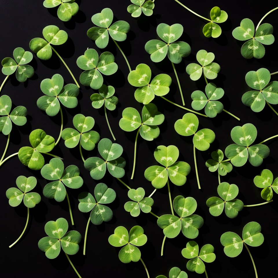 Multiple four-leaf clovers with green leaves and stems are scattered across a solid black background. The clovers are arranged in a flat lay composition, showcasing their distinctive four-leaf structure. Each clover stands out vividly against the dark surface.