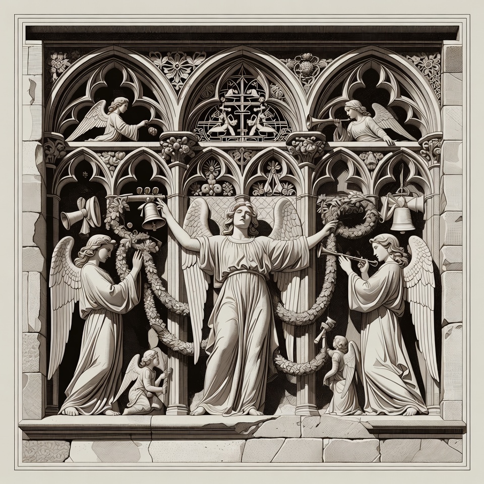 angel statue, arches, architectural detail, bells, cathedral facade, cherubs, church relief, cross, female angel, floral wreaths, garland, gothic architecture, gothic art, heavenly figures, illustration, ornate design, pointed arches, religious art, religious sculpture, sculpture, sepia tone, stone carving, winged beings, wings, angels