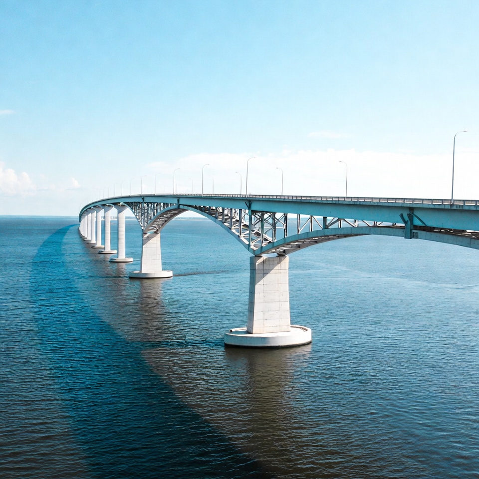 A long concrete bridge stretches across a calm body of water under a clear blue sky. Multiple white support pillars rise from the water, and streetlights line the bridge deck. Gentle clouds dot the horizon.