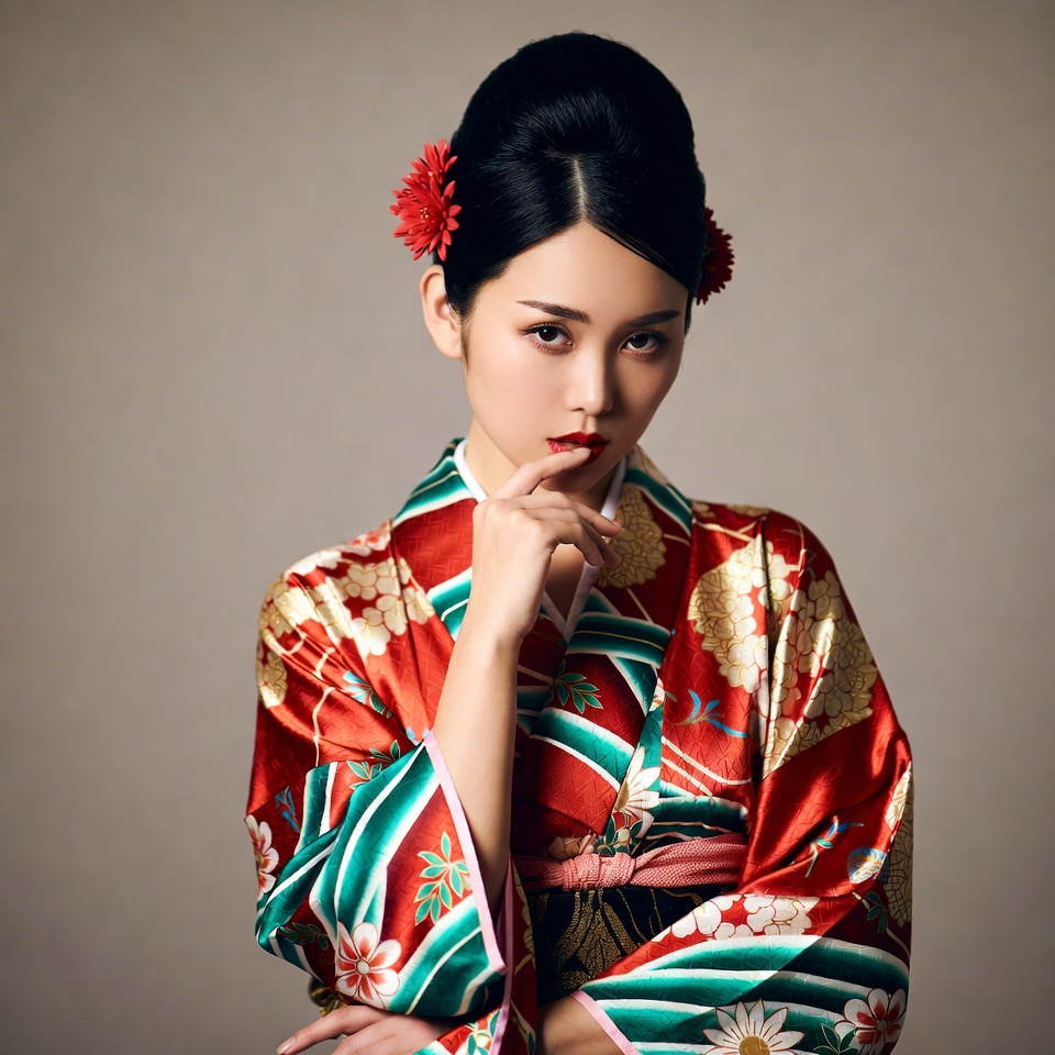 A young Asian woman with black hair styled in an updo and red flower hairpins poses thoughtfully with her hand on her chin. She wears a vibrant red kimono featuring gold floral patterns and green accents. She stands against a plain beige background.