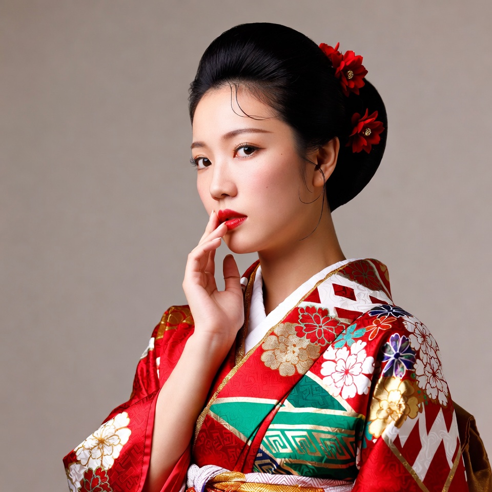 A young Asian woman with black hair styled in an elegant updo adorned with red flowers poses against a plain background. She wears a vibrant red kimono featuring intricate gold, white, and green floral patterns. Her hand is gently touching her red lips in a subtle gesture.
