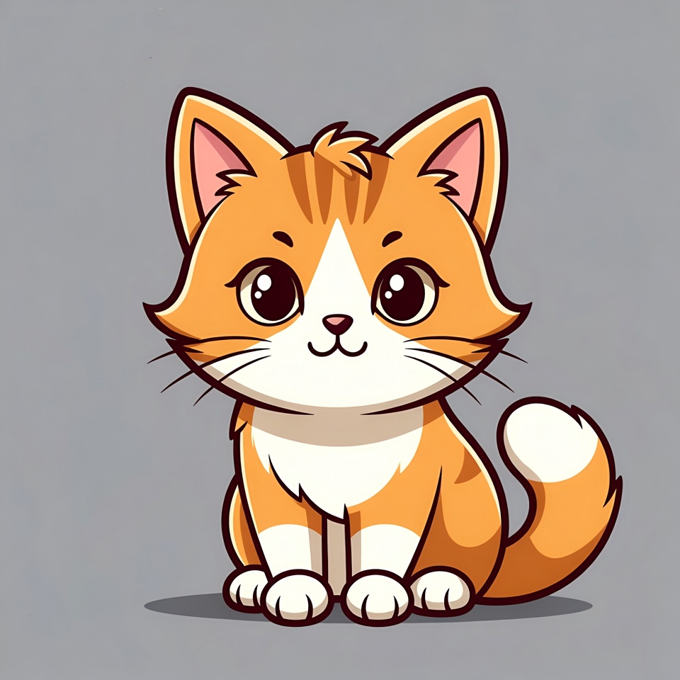 A cartoon orange tabby kitten with white paws and chest sits on a gray background. The kitten has big expressive eyes, perked ears, and a fluffy tail. It features a smiling mouth and detailed striped fur in a kawaii style.