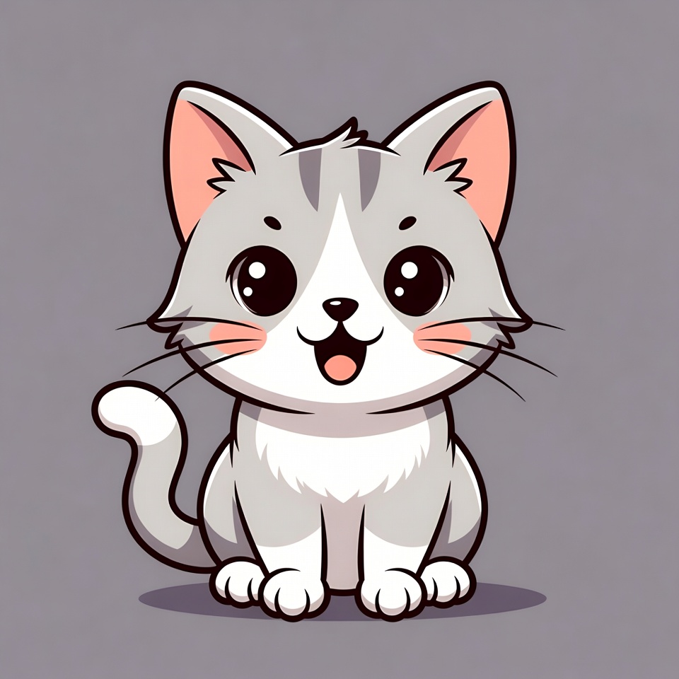 adorable animal, anime cat, big eyes, cartoon cat, cat whiskers, chibi cat, clipart, digital art, fluffy kitten, gray cat, happy kitten, illustration, isolated background, kawaii kitten, pink nose, smiling cat, tabby kitten, vector kitten, white paws, cute kitten