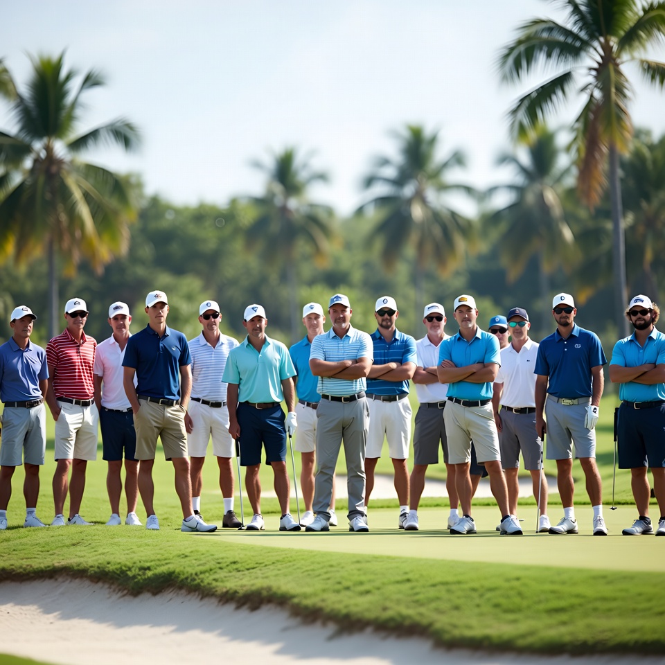 A large group of men wearing polo shirts, shorts, visors, and golf shoes stand together on a lush green golf course near a sand bunker. Palm trees line the background under a clear blue sky. They pose confidently with hands on hips or arms crossed.