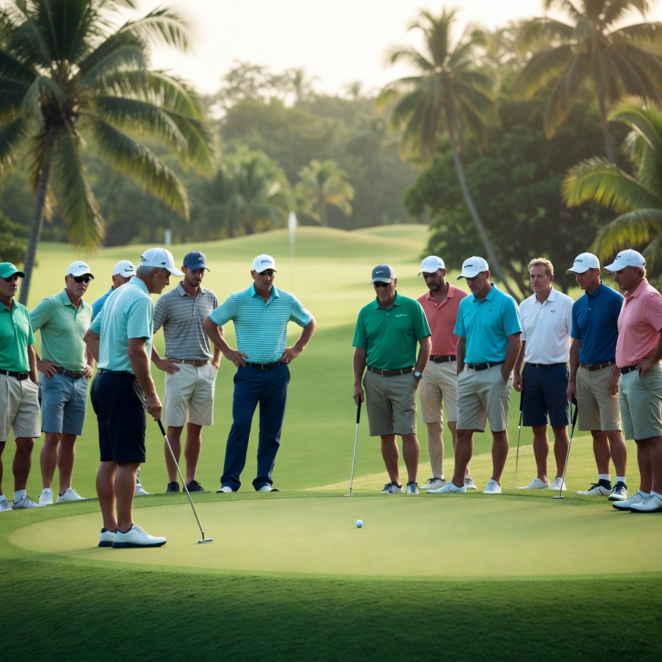 A group of men in colorful polo shirts and shorts stands around a putting green in a lush tropical golf course surrounded by palm trees. One man in a black shirt crouches to putt a golf ball while the others watch attentively. The scene features manicured grass, golf clubs, and a sunny backdrop with hills.