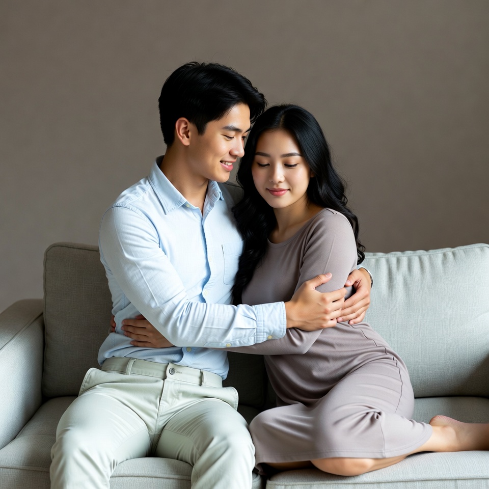 Asian man, Asian woman, bare feet, beige pants, black hair, blue shirt, couple, embrace, gray sofa, hugging, indoor, long hair, loving embrace, man, mauve dress, seated couple, short hair, smiling, sofa, woman, young man, young woman, Asian couple