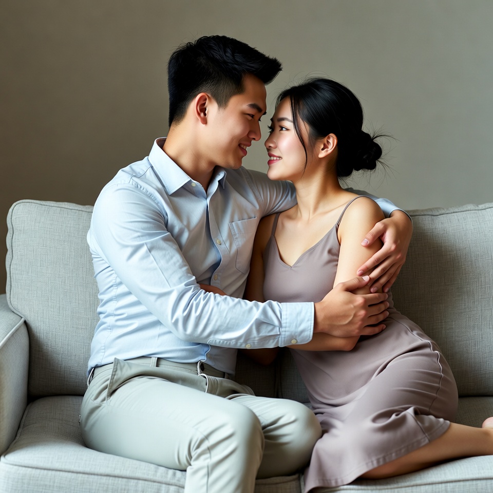 A young Asian man in a light blue shirt and gray pants sits on a gray sofa, embracing a young Asian woman in a pinkish slip dress. They gaze affectionately at each other with close faces. The woman has her black hair in a bun and sits with bare feet.