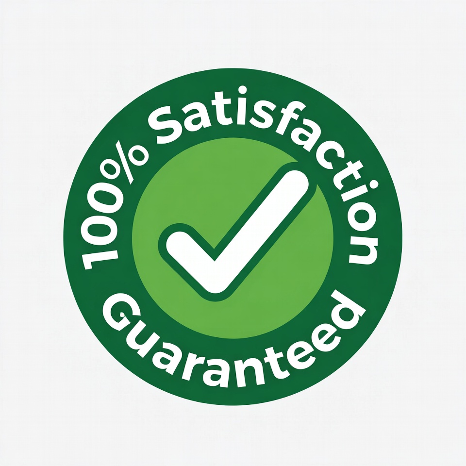A green circular badge features '100%' at the top with a bold white checkmark inside. Below the checkmark, 'Satisfaction Guaranteed' is written in white text on the green background. The design uses thick white outlines for a clean, bold appearance.