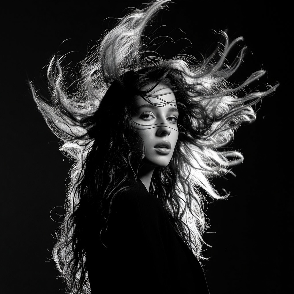 black and white, dark clothing, dark hair, dynamic hair, face, female, flowing hair, hair motion, headshot, isolated background, long hair, monochrome, portrait, serious expression, studio portrait, wavy hair, windblown hair, young woman, woman