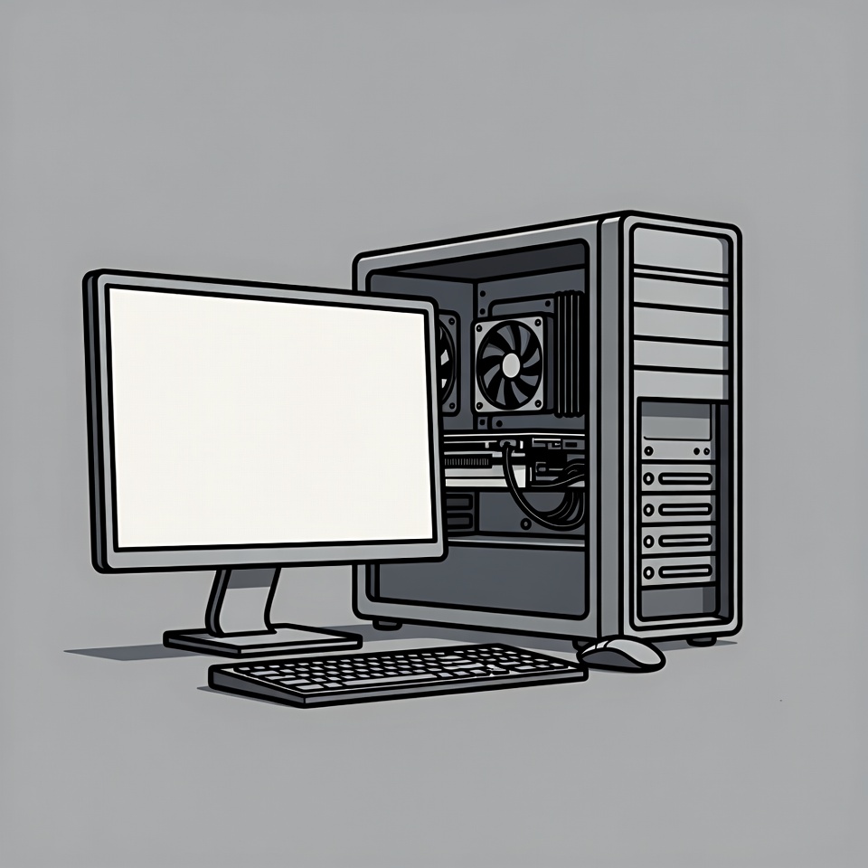PC case, blank screen, cables, clipart, computer hardware, computer tower, desktop setup, fans, graphics card, illustration, isolated background, keyboard, line art, monitor, open case, tech illustration, gaming PC