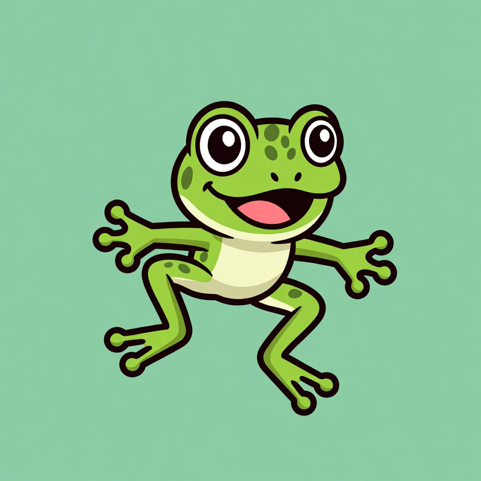 amphibian, animal, big eyes, cartoon frog, clipart, cute frog, fun frog, green frog, happy frog, illustration, isolated background, jumping frog, kawaii frog, playful pose, smiling frog, spots, vector art, white belly, frog