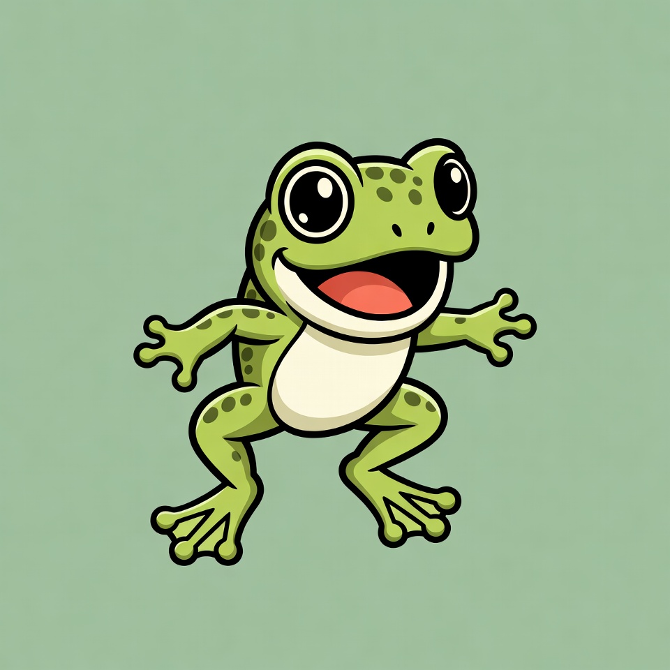 A cute cartoon frog with big eyes and green skin covered in black spots stands on a light green background. It has a wide smiling mouth revealing a red tongue and white underbelly. The frog spreads its arms and legs wide in a playful pose.