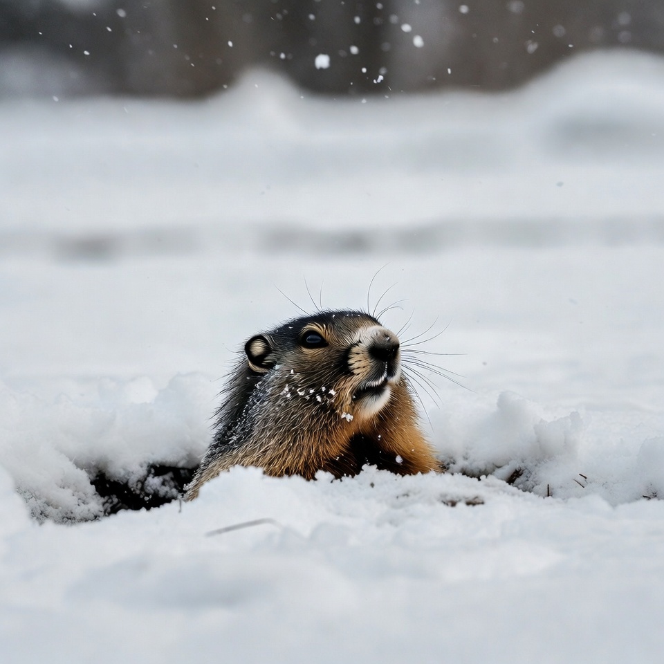 A groundhog with brown and orange fur peeks out from its burrow in deep snow. Snowflakes fall around it against a blurred snowy forest background. The animal looks alert with whiskers and small ears visible.