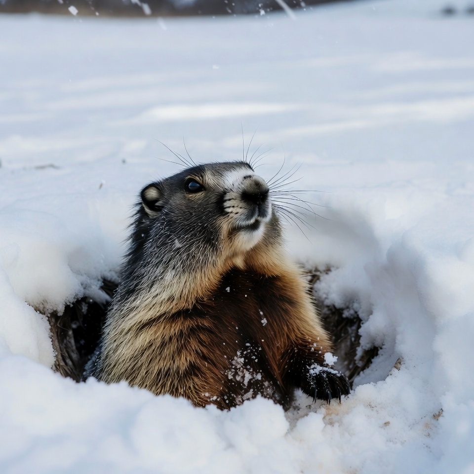 A marmot with brown and gray fur peeks out from a burrow in deep snow. Snow covers its head and body as it looks upward with alert eyes. The background features a snowy landscape with scattered snow particles.