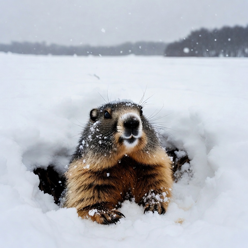 A fluffy groundhog with brown and gray fur peeks out from its snowy burrow in a winter landscape. Snowflakes fall around it on a vast white snowy field with distant trees and gray skies. The animal sits with its front paws on the snow, looking directly at the camera.
