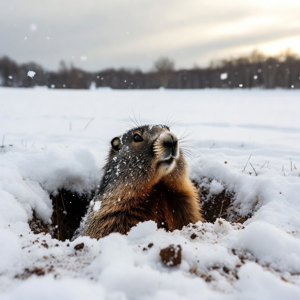 A woodchuck peeks out from its burrow in a snowy field during winter. Snowflakes fall around it against a backdrop of bare trees and a cloudy sky. The rodent has brown fur dusted with snow and looks alert.