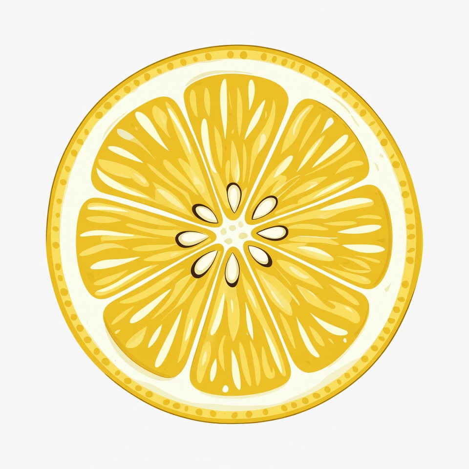 A vibrant illustration of a lemon slice with yellow pulp and white rind. It features segmented juicy flesh and small white seeds in the center. The design is isolated on a white background.