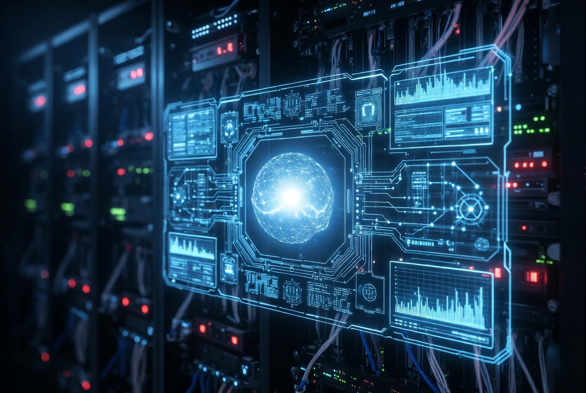 A glowing holographic brain floats within a futuristic digital display surrounded by server racks. Neon green and blue holographic interfaces with graphs and data visualizations overlay the brain. Red lights illuminate the dark server room background.