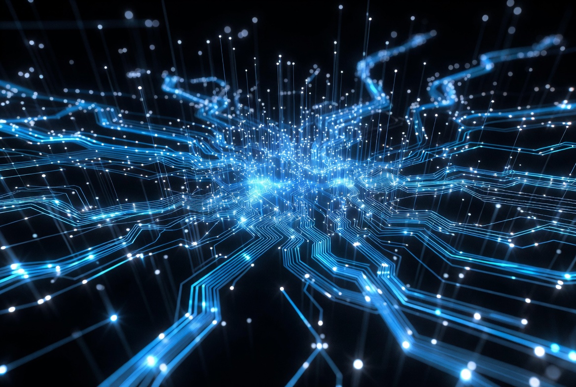 A vibrant digital illustration of a glowing blue circuit board pattern on a black background. Intricate glowing lines and nodes radiate outward in a symmetrical, explosive design. Bright blue lights and traces create a futuristic neural network effect.