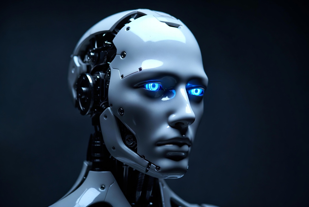 Futuristic robot head with blue eyes
