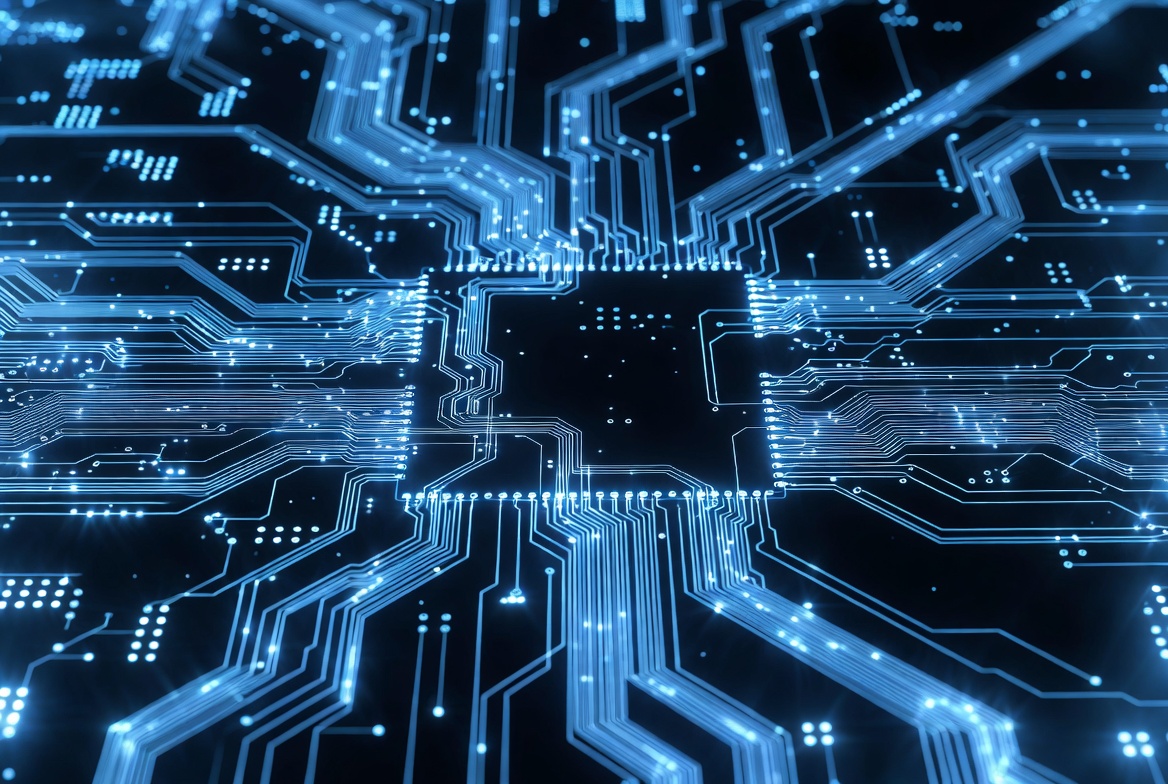A close-up view of a detailed circuit board with glowing blue traces and pathways. A central black square chip is surrounded by intricate networks of illuminated lines and components. The image features a high-tech, futuristic design on an isolated dark background.