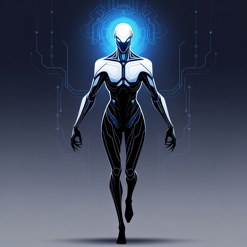 A digital illustration of a sleek female cyborg with white and black armor and glowing blue accents strides forward. She has a glowing blue halo around her head and cybernetic limbs against a dark background with neon circuit patterns. Her design features sharp lines and futuristic elements on an isolated background.